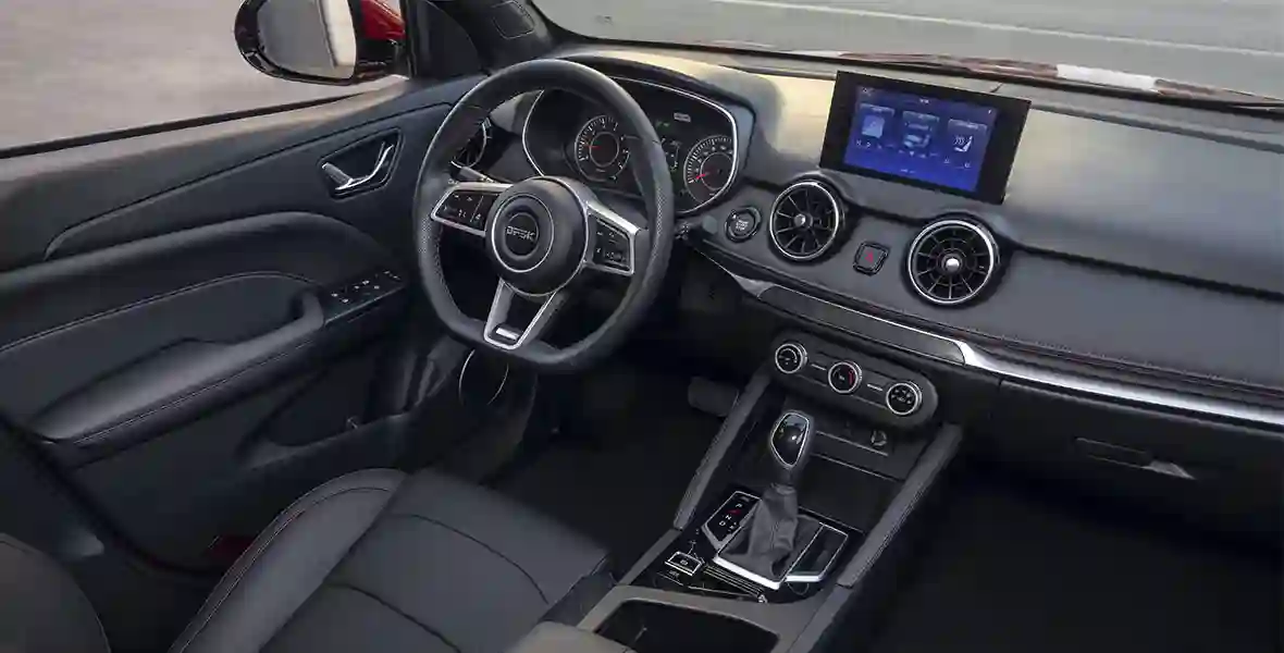 Интерьер нового кроссовера отличается выверенной эргономикой в классическом европейском стиле и особой элегантностью благодаря высококачественным материалам отделки и эффектным элементам оформления – в частности, похожим на воздухозаборники турбин дефлекторам вентиляции или декоративным вставкам дверей. Мультифункциональный руль D-образной формы со срезанным нижним сегментом и сиденья DFSK 500 обшиты высококачественной экокожей с перфорацией. Кресло водителя регулируется в шести направлениях, кресло переднего пассажира – в четырех.